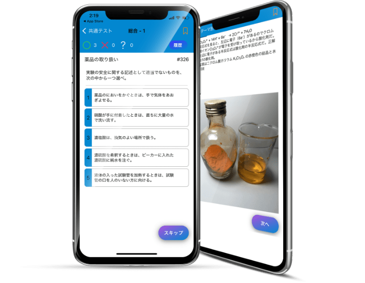 現在リリースしているものは 高校化学の化学基礎の分野で1問ずつ答えていく形式で約300問あります。それぞれの問題にはイラストや写真の入った詳細な解説もついており、参考書+問題集のように使えます。短時間で解いていかなくてはならない入試の世界、スピード感あふれるトレーニングができます。